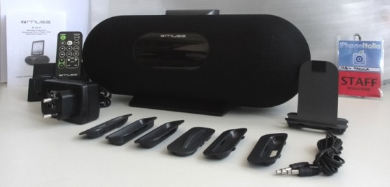 Per riprodurre i brani presenti su iDevices, bisogna semplicemente inserire l’iPad, l’iPhone o l’iPod (in caso possiamo utilizzare uno dei 5 adattatori iPod inclusi nella confezione) nell’apposito supporto, cliccare sul tasto “Function” fino a far apparire la scritta “iPhone” sul display del Muse ed avviare il brano.