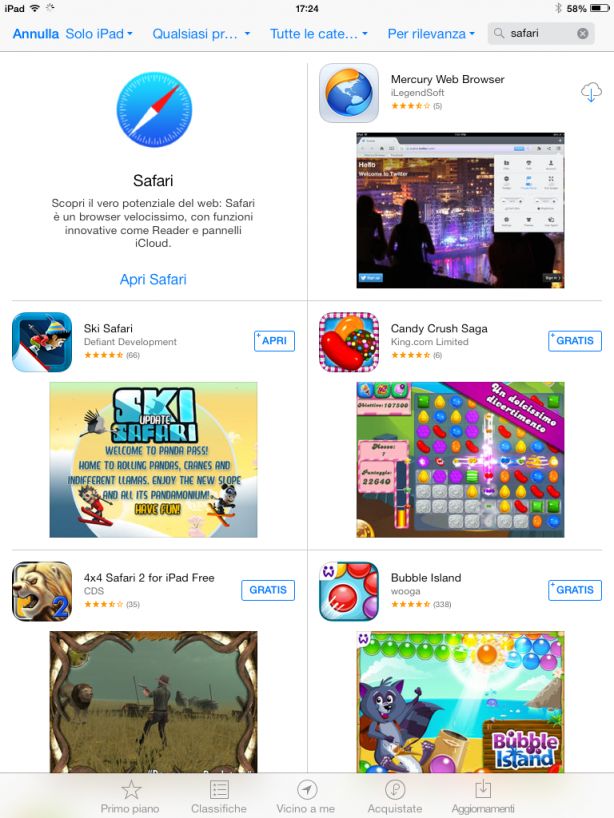Andando su App Store e digitando i nomi di alcune app native, come Safari o Messaggi, vedremo comparire il risultato relativo, con una piccola presentazione dell’app e la possibilità di aprirla o di leggere ulteriori informazioni.