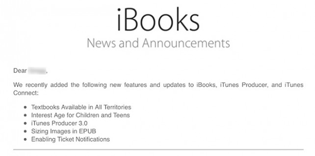 La notizia ci giunge da AppleInsider che ha ricevuto la nota informativa da un autore di iBooks. “L’età di interesse per bambini e ragazzi” è solo una delle novità aggiunte all’iBookstore. Nella nota, Apple specifica che il sistema è stato arricchito di nuove funzioni, come ad esempio il ridimensionamento delle immagini in EPUB, l’aggiornamento di iTunes Producer 3.0, la distribuzione degli iBooks in tutti i territori, ecc. Le categorie per l’età d’interesse sono “Juvenile Fiction”, “Children’s”, “Young Adult”, “Educational” e “Jeunesse”