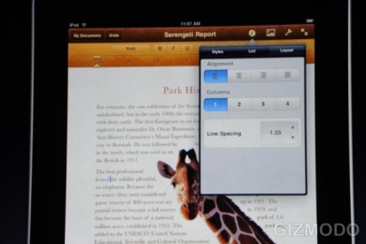 La versione per iPad di Pages (word-processor) permette ovviamente di visualizzare e modificare i file di testo, sempre mediante la tastiera a comparsa dell’interfaccia touch. Questo applicativo permette un editing molto veloce e intuitivo, soprattutto per la gestione dei contenuti multimediali, che possono essere inseriti nel testo con auto-wrapping. Il navigatore laterale permette di saltare con facilità da una pagina all’altra.