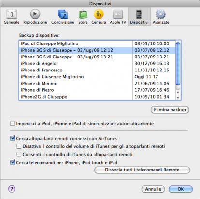 Una volta salvata la cartella andate su iTunes, aprite le preferenze e andate nella scheda “Dispositivi”. Da qui selezionate il vostro device e cancellati il backup cliccando su “Elimina Backup“.
